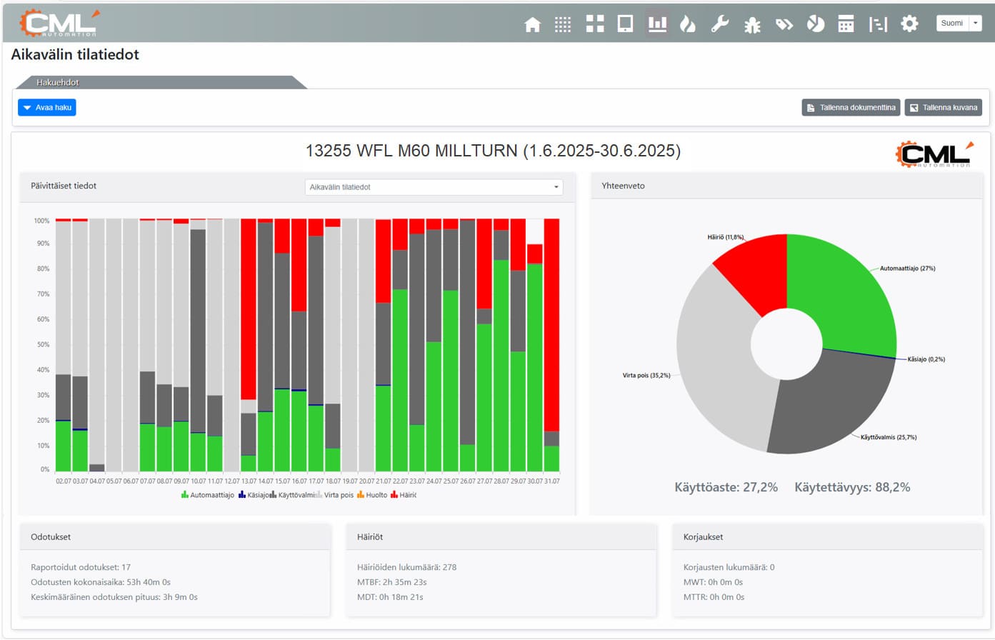 The system enables standardized reporting of waits and failures. Reported downtimes are saved in the fault and wait history for later analysis. Information about where failures and waits actually occur is valuable, e.g. in identifying equipment performance problems, planning maintenance and deciding on new investments.